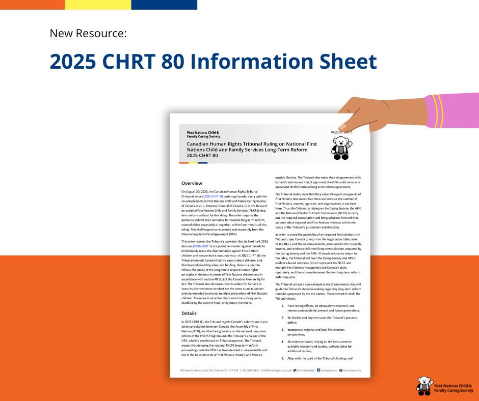 On August 20, 2025, the Canadian Human Rights Tribunal (Tribunal) issued 2025 CHRT 80, ordering Canada, along with the co-complainants, the Caring Society and the Assembly of First Nations to move forward on national long-term reform of First Nations Child and Family Services (FNCFS) and submit a plan jointly or separately for December 22nd , 2025. This was to happen concurrently and separately from the Ontario Final Agreement (OFA).