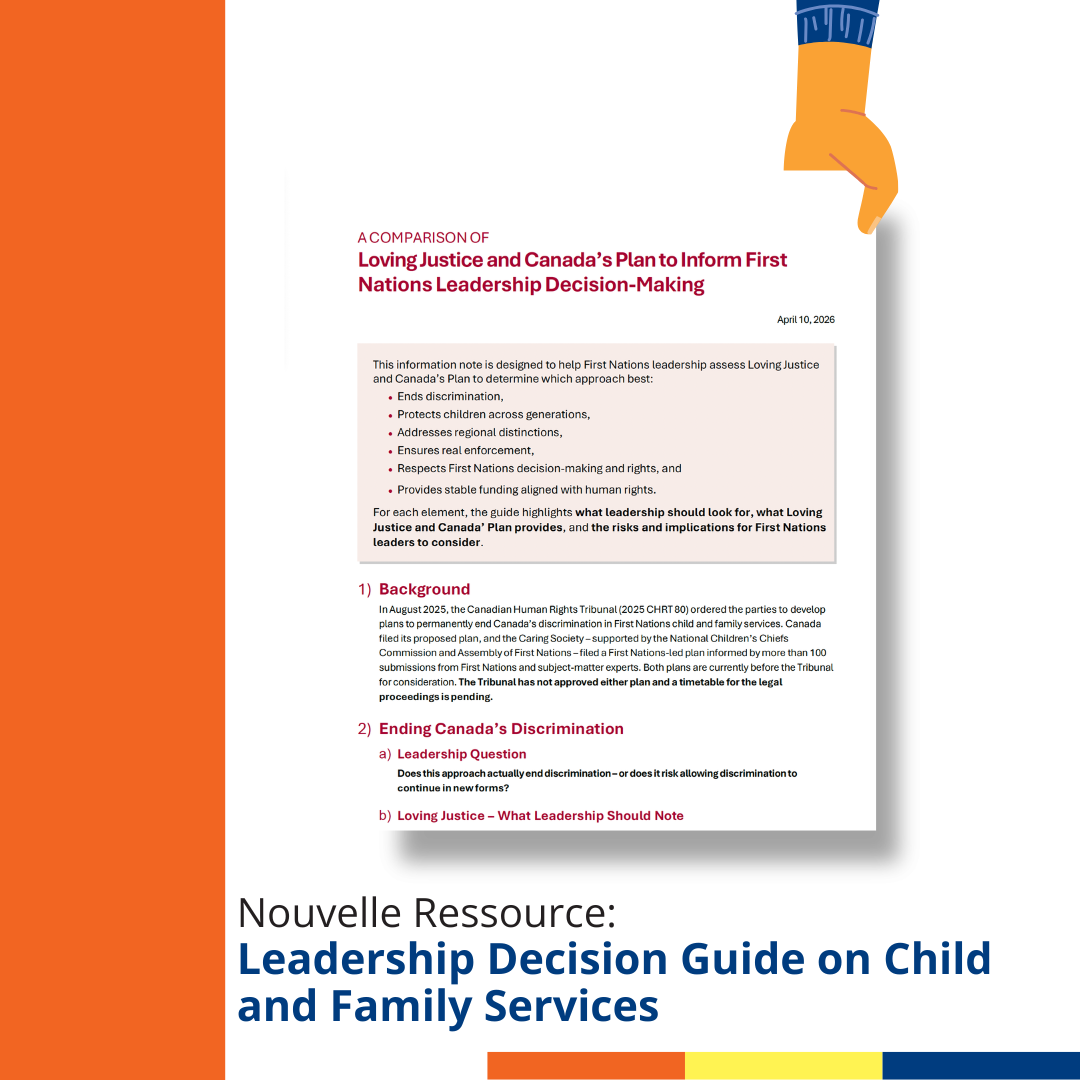 Following national engagement, the Loving Justice Plan was submitted to Tribunal as the First Nations-led designed plan to permanently end Canada’s discrimination in FNCFS. Built from 100+ engagement submissions from leaders, youth, Elders and technical experts, the Loving Justice Plan outlines national minimum standards with enforceable accountability, needs-based funding and First Nations-led governance. Canada also submitted its own plan, leading to two distinct proposals before the Tribunal. The Tribunal has not yet rendered a decision on next steps, including whether it will select one plan, require revisions, or combine elements of the proposals submitted.